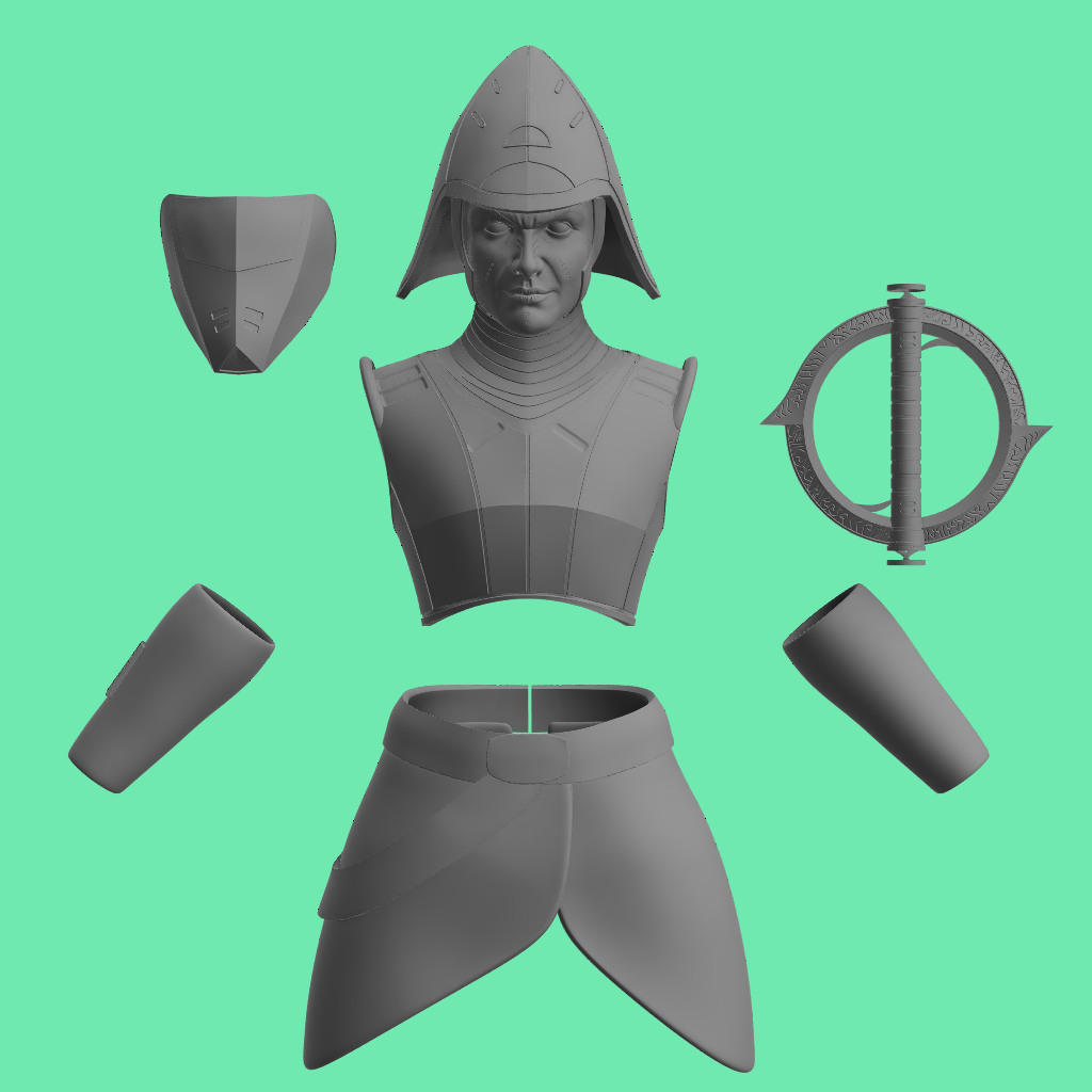 3D printed 7th sister head sculpts, armor and accessories for 3.75" and 6" female figures. Refer to sizing option for which kit suits which female figure.