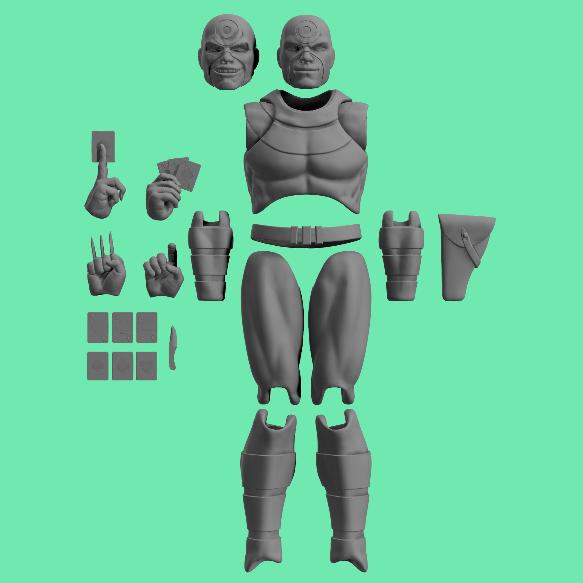 3D printed Bullseye head sculpts and accessories for CT Toys Daredevil figure.