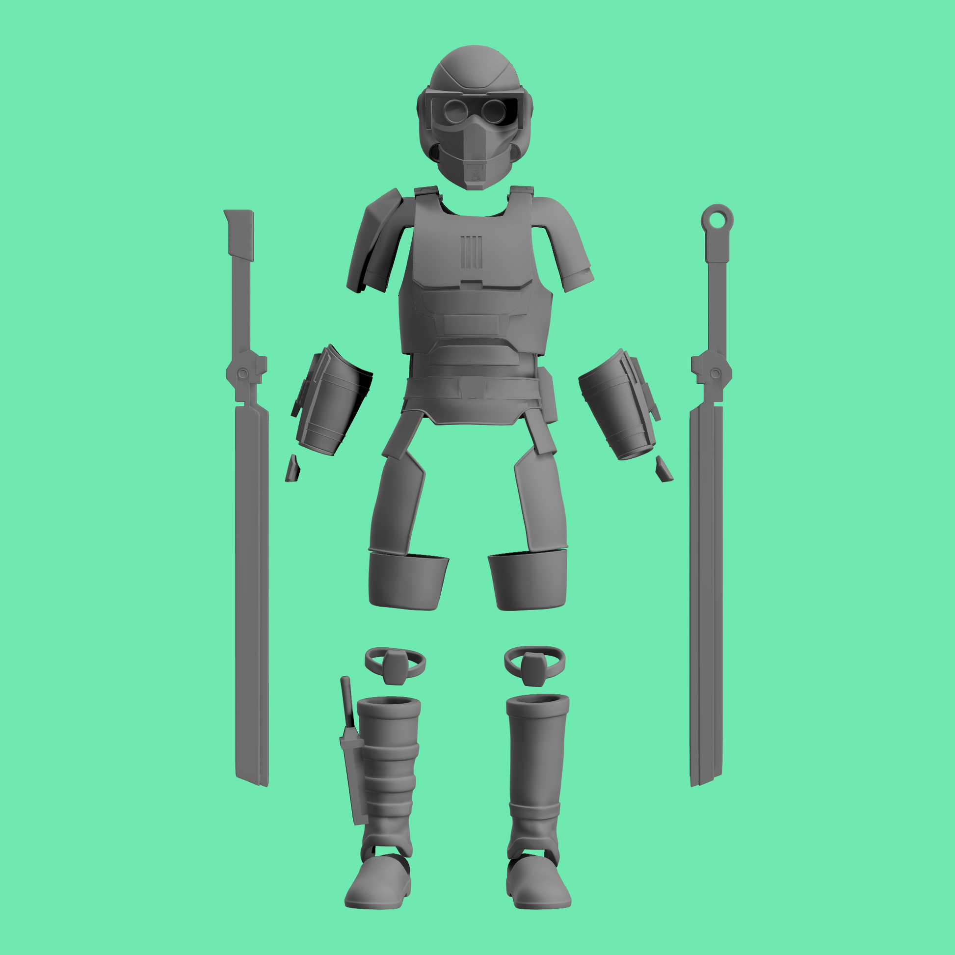 3D printed Clone CX-4 armor and accessories for 3.75" and 6" figures.