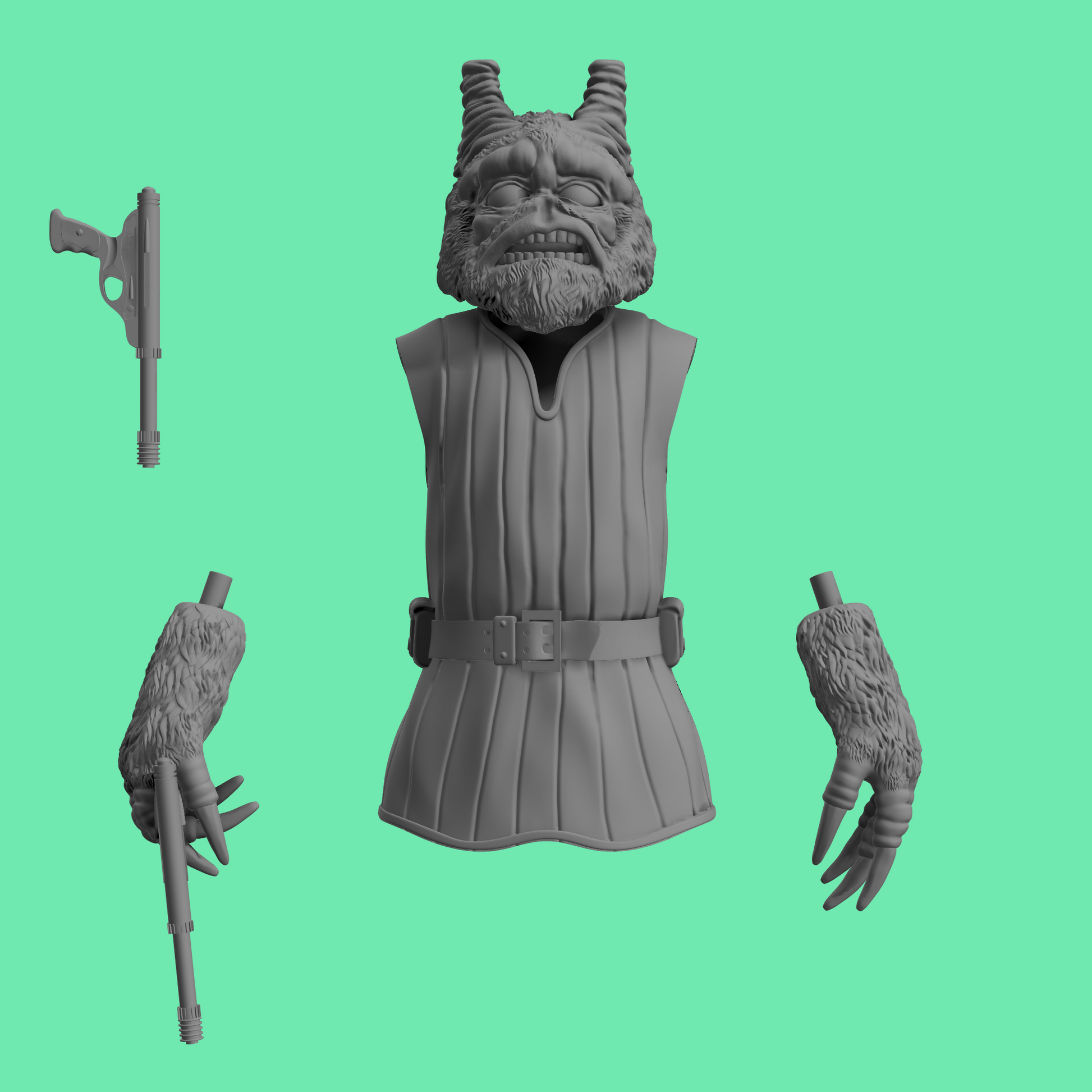 3D printed Feltipern Trevagg head sculpt and accessories for 3.75" and 6" figures.