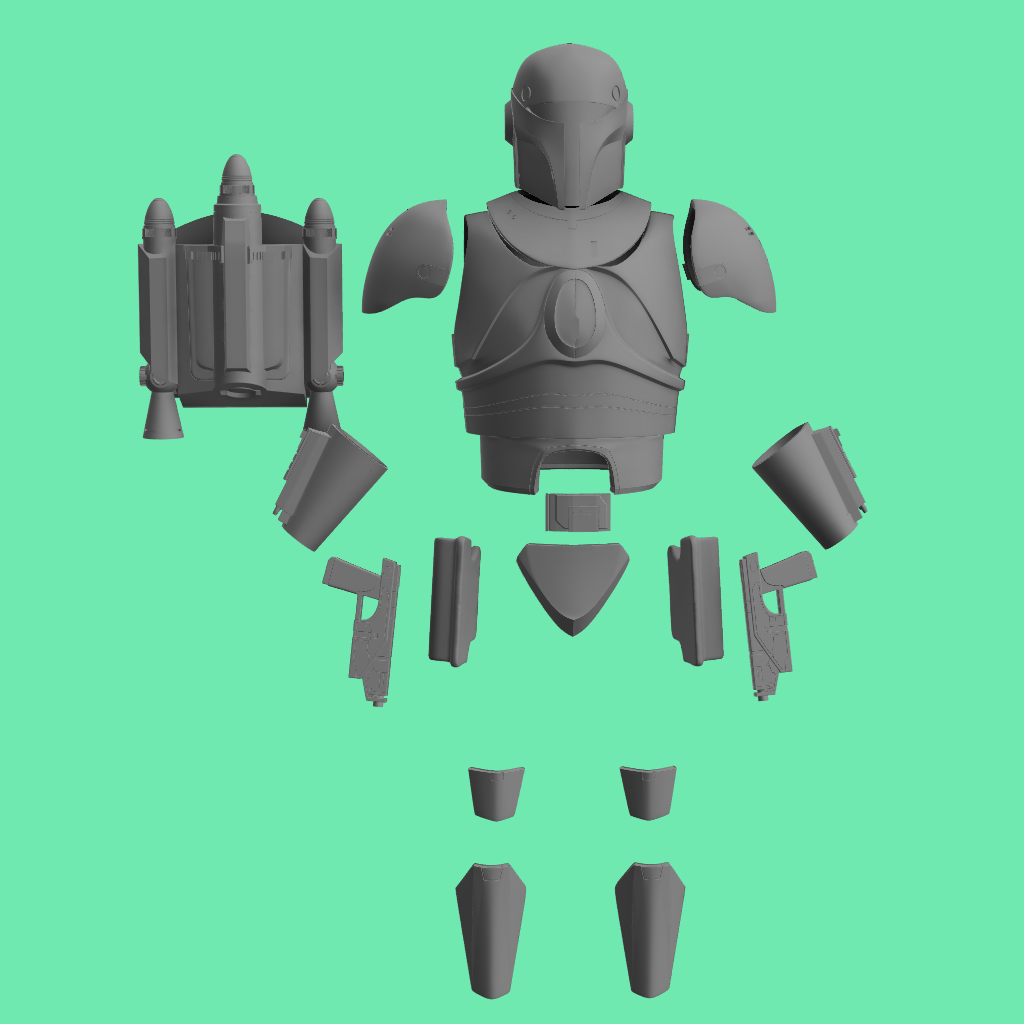 3D printed Fenn Rau armor and accessories for 3.75", 6" and 12" figures.