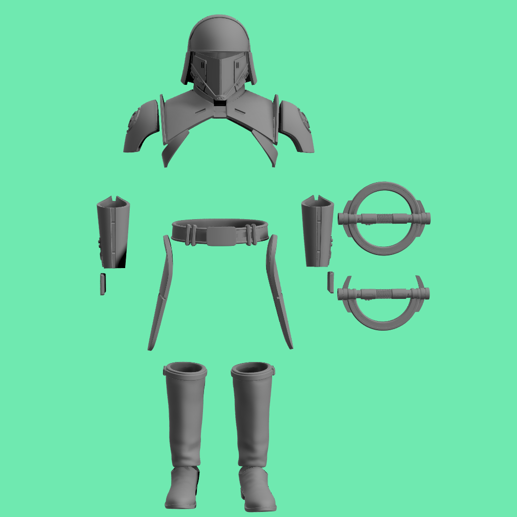 3D printed Inquisitor concept armor and accessories for 3.75" and 6" figures.