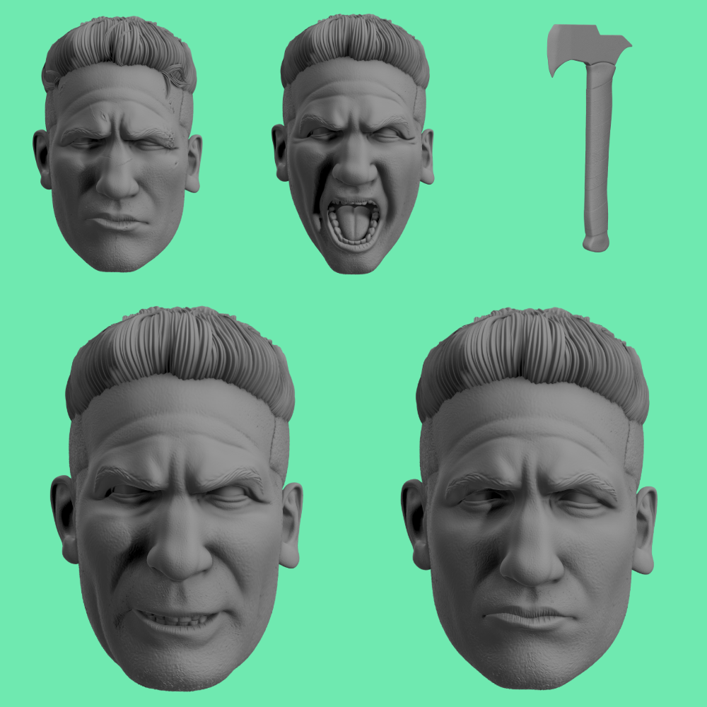 3D printed Punisher head sculpts and axe for 6" SHF, Mafex and 6" Marvel Legends figures.