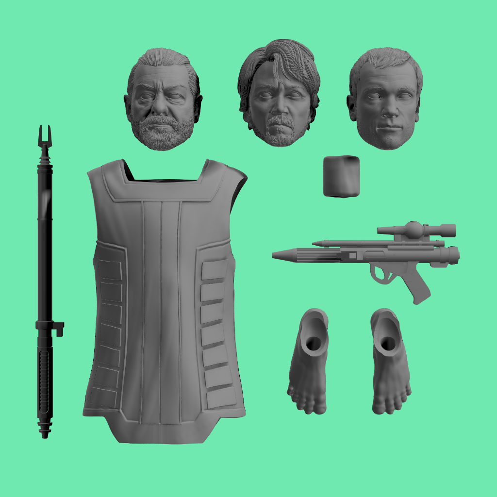 3D printed Narkina Prisoners head sculpts and accessories for 3.75" and 6" figures.