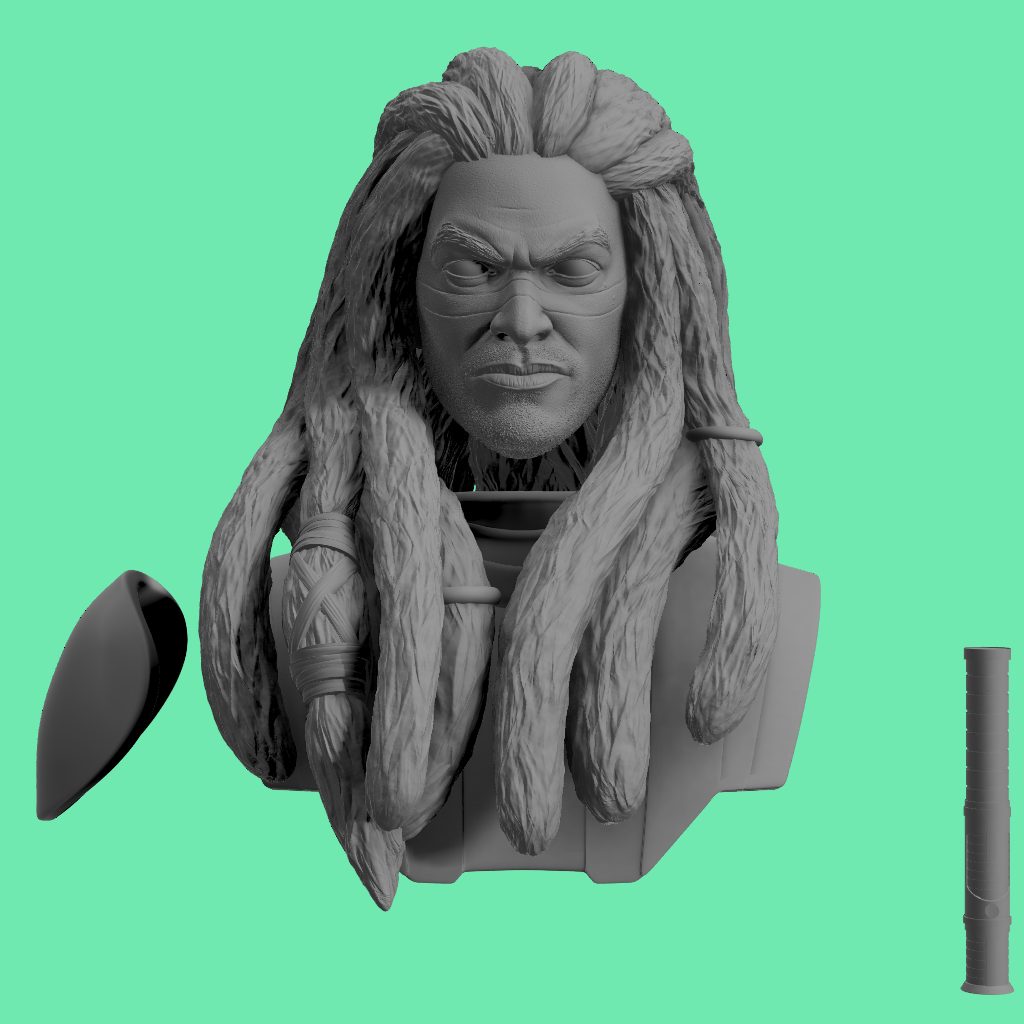 3D printed Quinlan Vos head sculpt and accessories for 3.75", 6" and 12" figures.