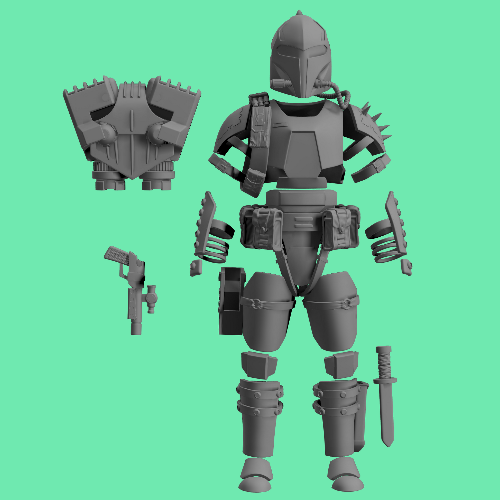3D printed Rohlan Dyre armor and accessories for 3.75" and 6" figures.